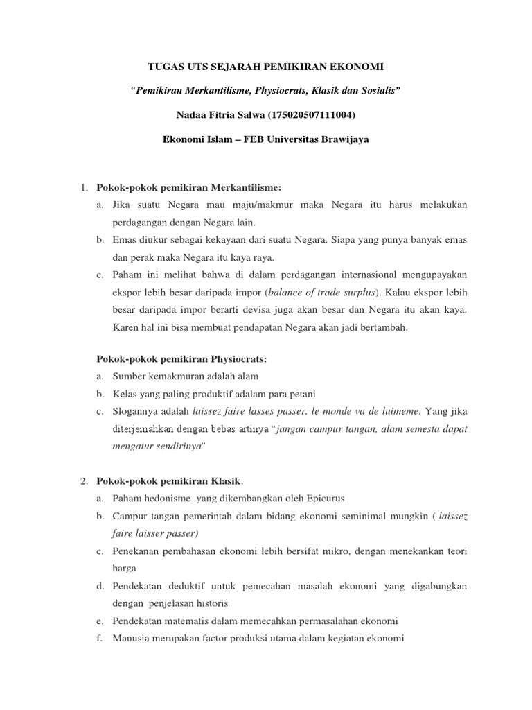 Semester 4 Spe Tugas Uts Pemikiran Merkantilisme Physiocrats Klasik Sosialis Docx