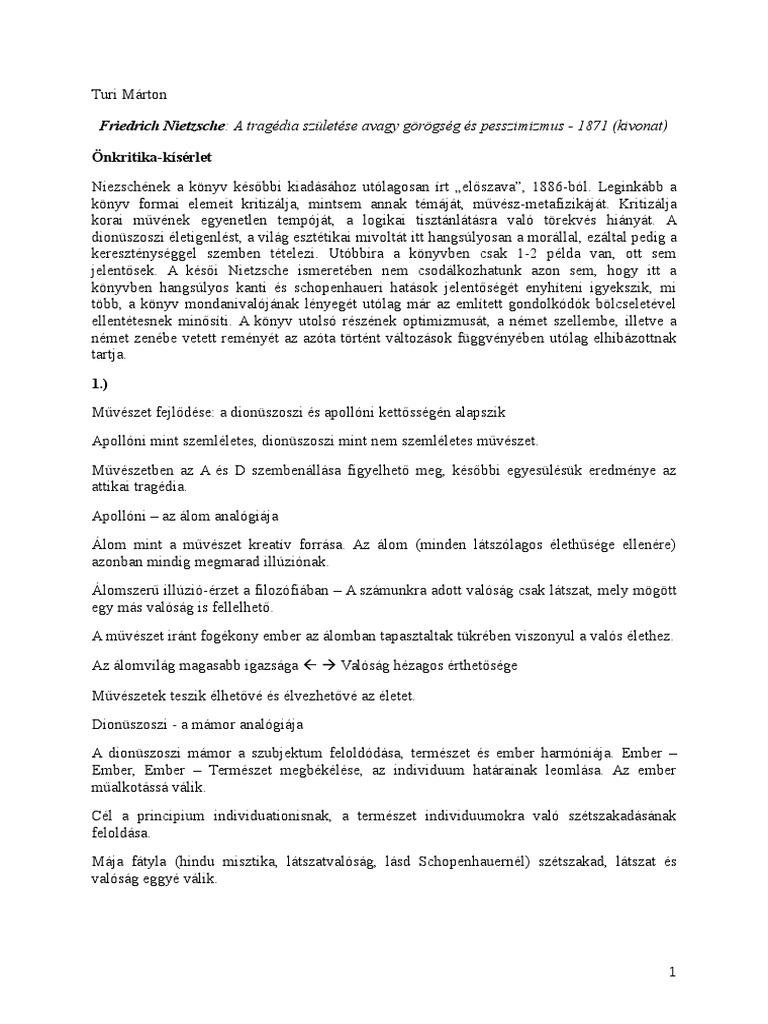 Friedrich Nietzsche A Tragedia Szuletese Avagy Gorogseg Es Pesszimizmus 1871 Kivonat