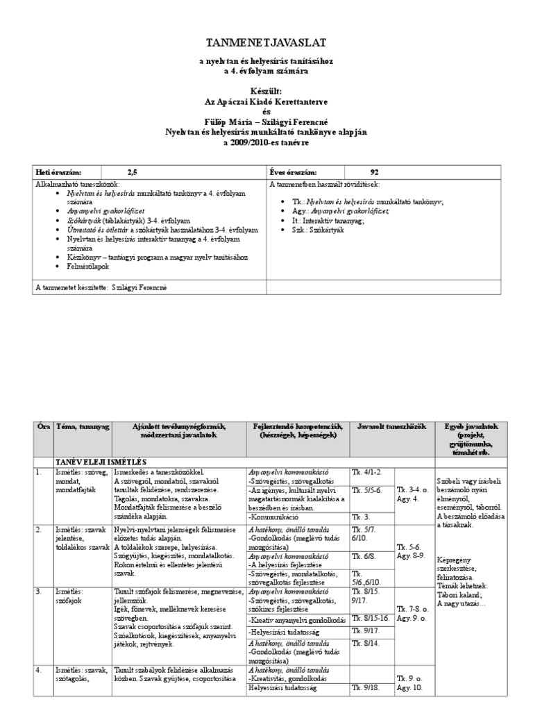 Nyelvtan Es Helyesiras 4 Tanmenet