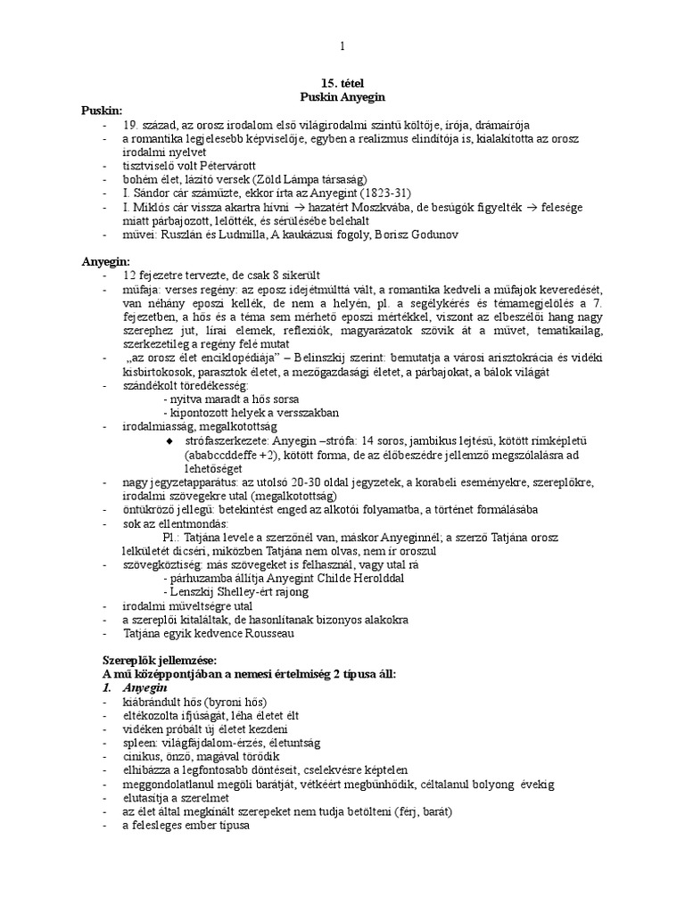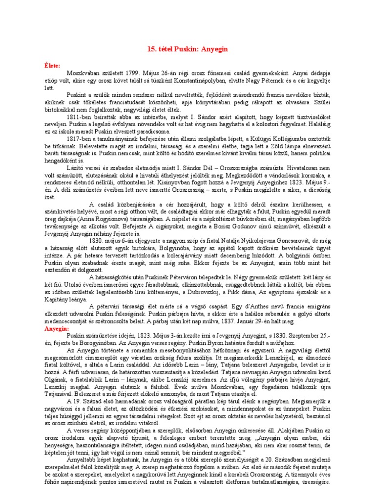 Puskin Anyegin érettségi Tétel